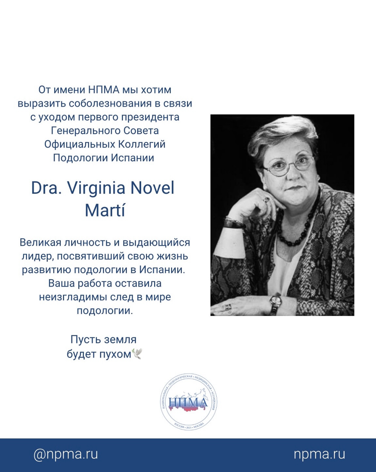От имении НПМА выражаем признательность Dra. Virginia за вклад в развитие подологии и скорбим вместе с испанским профессиональным подологическим сообществом.